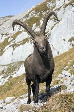 The Alpine ibex (Capra ibex) is a species of wild goat that lives in the Alpine Mountain Range.