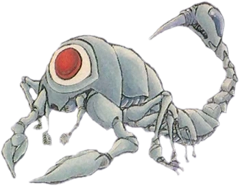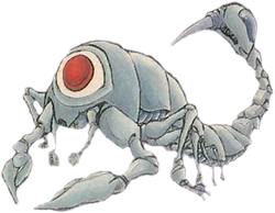 Arurodas are a species of arachnids, very likely related in some way to the more ancient Arachas once found in Lanayru Desert, which they may in fact have evolved from over the centuries given the large gap between both species' existence, similar physiological build, and lack of known overlapping existence. However, unlike Aracha and their four legs, Aruroda have a full complement of eight legs, though unlike most scorpions they lack chelae of any kind; instead they rely upon a stinger that can emit fireballs to hit victims and threats alike from a distance. Aruroda exoskeletons are very tough and cannot be pierced by any known normal means. Wary adventurers can still take them down by waiting for them to open their eyes in order to see, which is its weak point. They are also vulnerable to the Thunder spell to those of magical inclination though they are immune to the Fire spell due to their utilization of the same element for their own magical attacks. It should be noted that a Magical Shield cannot stop these fireballs and a Reflect spell must be used instead.