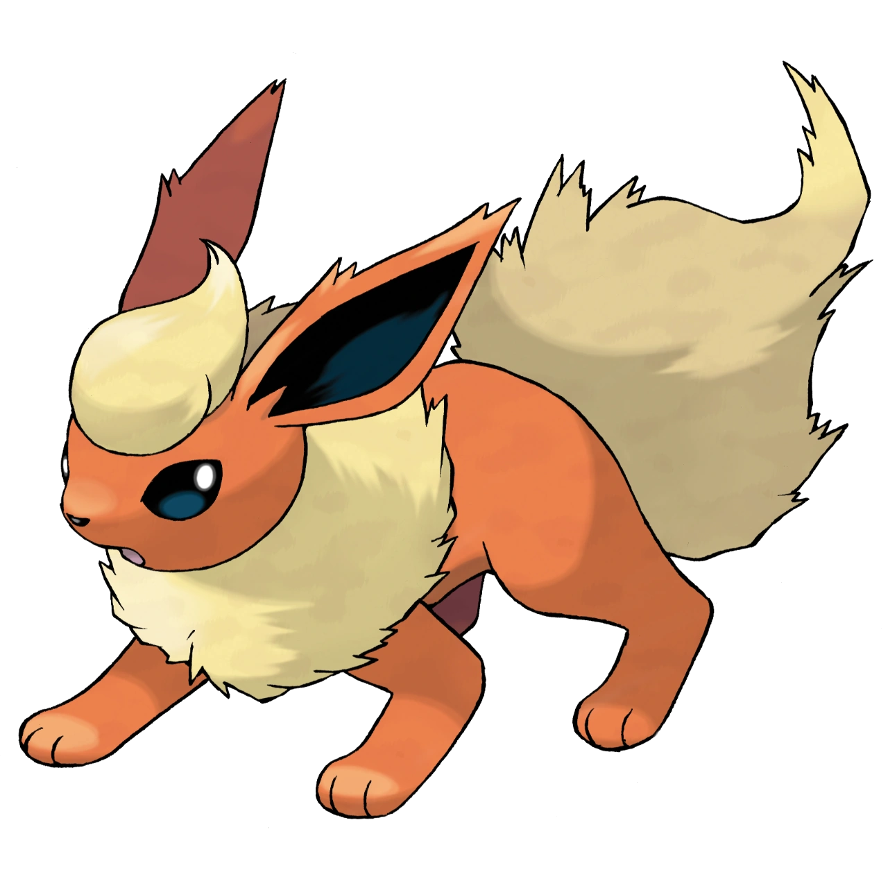 Flareon, the Flame Pokémon, is the Fire-type evolution of this species. They have red-orange fur with yellow tufts and a yellow tail, resembling fire. They are best known for their fire manipulation and generation attacks. They evolve from Eevee that are given a fire stone.