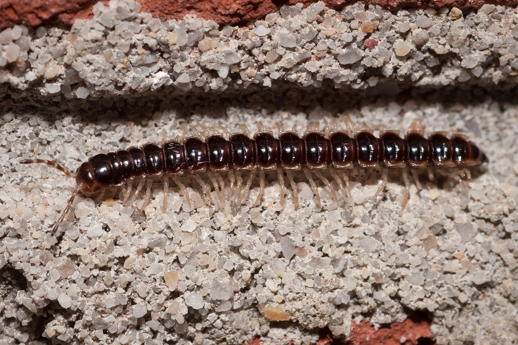The greenhouse millipede is a Paradoxosomatid millipede that has been widely introduced around the world. They are brown in color with pale cream-colored legs and lateral plates. Mature greenhouse millipedes attain lengths between 18 to 23 millimeters (0.71 to 0.91 inches) and widths from 2 to 2.5 millimeters (0.079 to 0.098 inches). When fully grown, it will have 60 legs and about 15 body segments. The dorsal section of each segment features transverse groove, a characteristic commonly found in Paradoxosomatids. The greenhouse millipede possesses no eyes, as a result, it relies on it's antennae to sense it's environment.