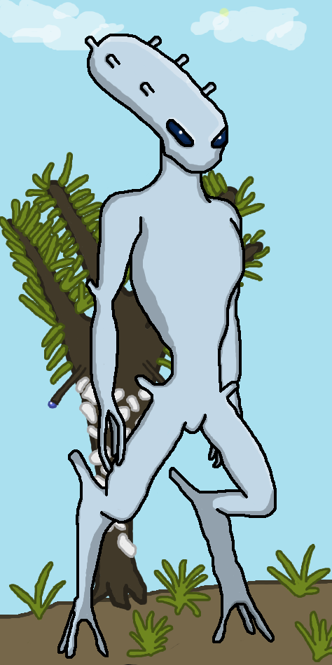 Their heads are elongated and mostly featureless. Upon this head are two eyes—large, glinting oval organs which reflect a large amount of light, even in a dim location (it is said that their eyes "glint like a thousand midnights", even in the darkness). These eyes are always a single, solid color, but can be either jet black or very dark blue. Several small horn-like projections extend from the skull, allowing direct atmospheric intake into their cerebral ganglion—their answer to the brain. Other extensions grow out of the elbows and ankles, while the pelvis bones themselves also protrude significantly. It is believed that these extensions serve as anchors for powerful musculatures, although direct scientific knowledge of their species is mostly anecdotal, due to their refusal to associate with other sapient species.