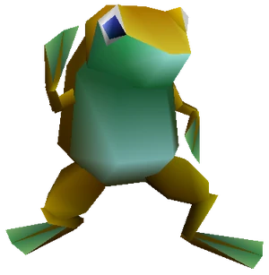 A Touch Me is a species of magical frog found in the jungles outside of Gongaga as well as in numerous forests dotting the landscape of Gaia. They have also been witnessed inhabiting the Living Woods on another, unnamed world. As a whole they are hostile towards adventurers for reasons unknown, which is often considered a nuisance amongst travelers as their very touch transforms their victims into Frogs as well. Luckily, outside of this their attacks do little damage and they themselves cannot suffer much damage before perishing. They have a weakness towards Matra Magic, which ought to be used to bring them down should an individual possess it. They will often sing, which will magically transform the individuals who hear the tune into a Toad as well as put them to sleep; there is a one-in-five chance that it will counter any magical attack made upon it with this Frog Song. Individuals who are currently frogs will never be targeted by a Touch Me's Frog Song, however, indicating some level of intellect although the extent of this is not known.